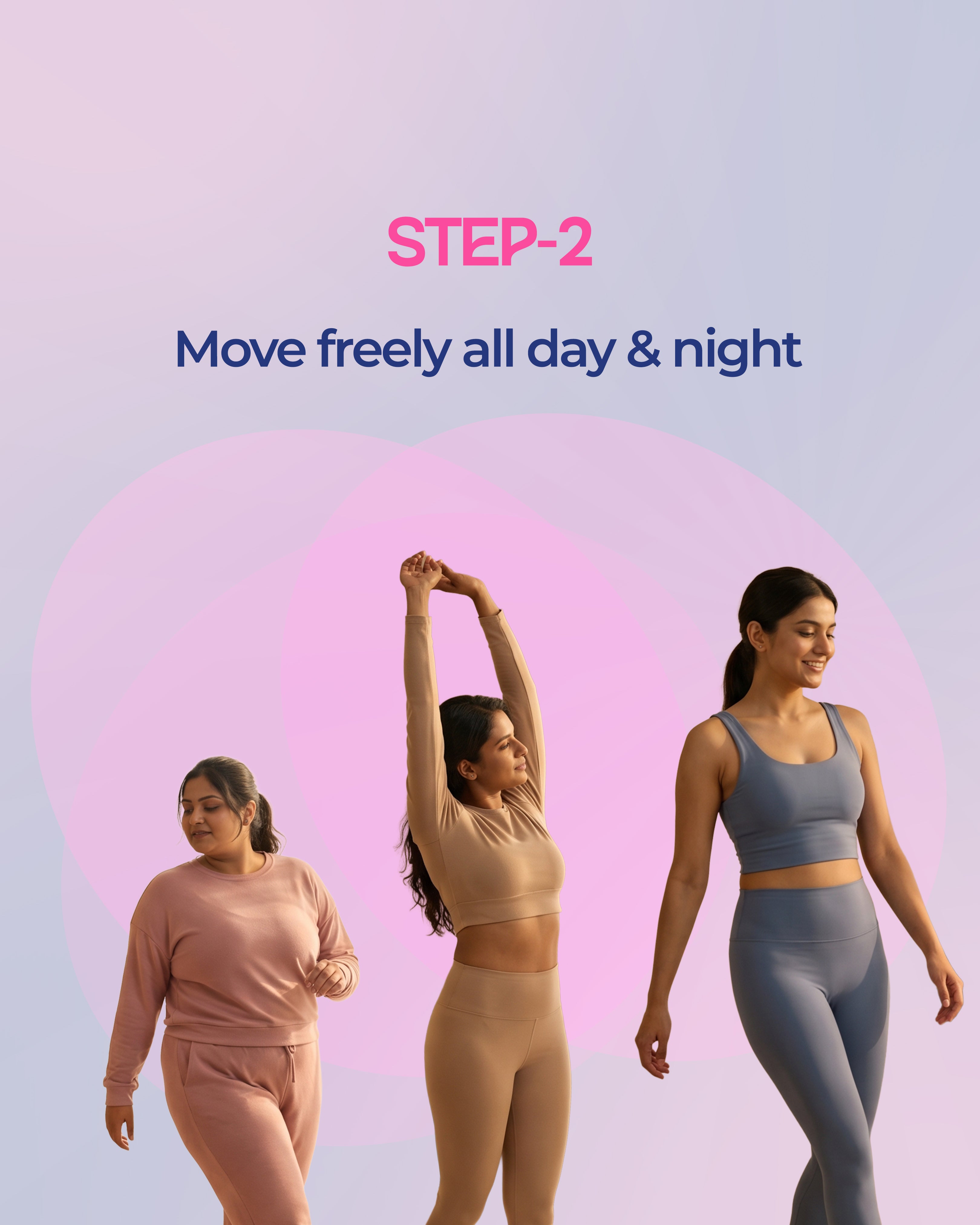 Our absorbent core locks in leaks and keeps you feeling dry for up to 12 hours — covering you all day and all night. No pads, no tampons needed. Just wear and move.